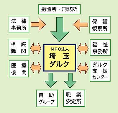 埼玉ダルクでは、薬物依存症者の回復を支援するために、地域の関係機関とのネットワークづくりをしています。本人のクスリをやめたいという気持ちに寄り添って、社会復帰するまでの長い道のりを、チームで連携を取りながらサポートしていきます。その連携は下図のようなものです。